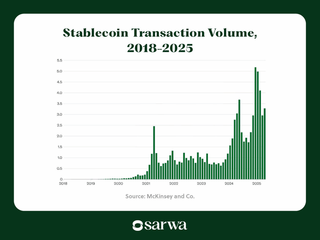 Stablecoin transaction volumes already exceeded $27 trillion per year, from their insignificant beginnings in 2018, as seen below: