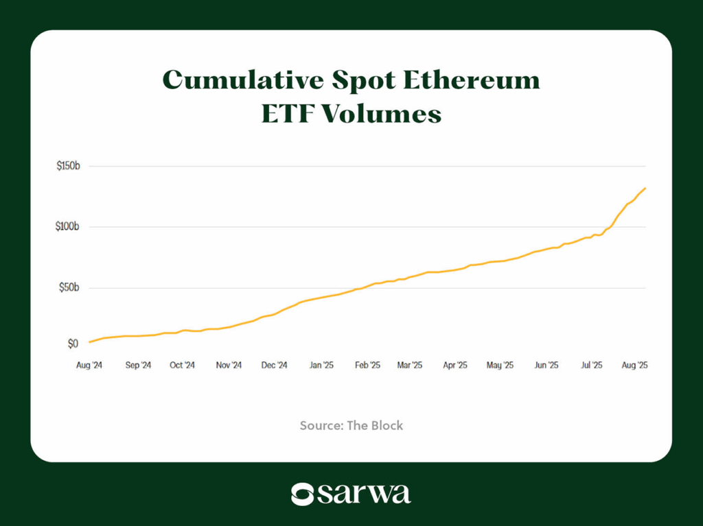As seen below, the cumulative trading volume of Ethereum ETFs has been on a steady upward trend since then: