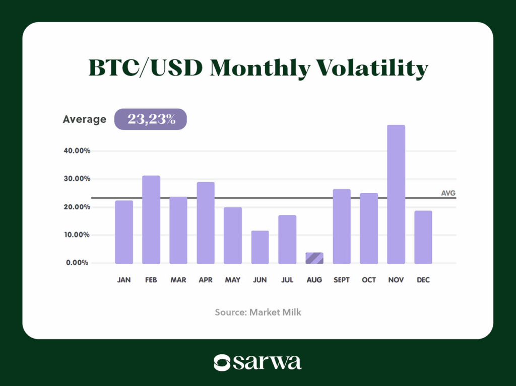 Over the past 12 months, Bitcoin’s average monthly volatility is 23.23%.